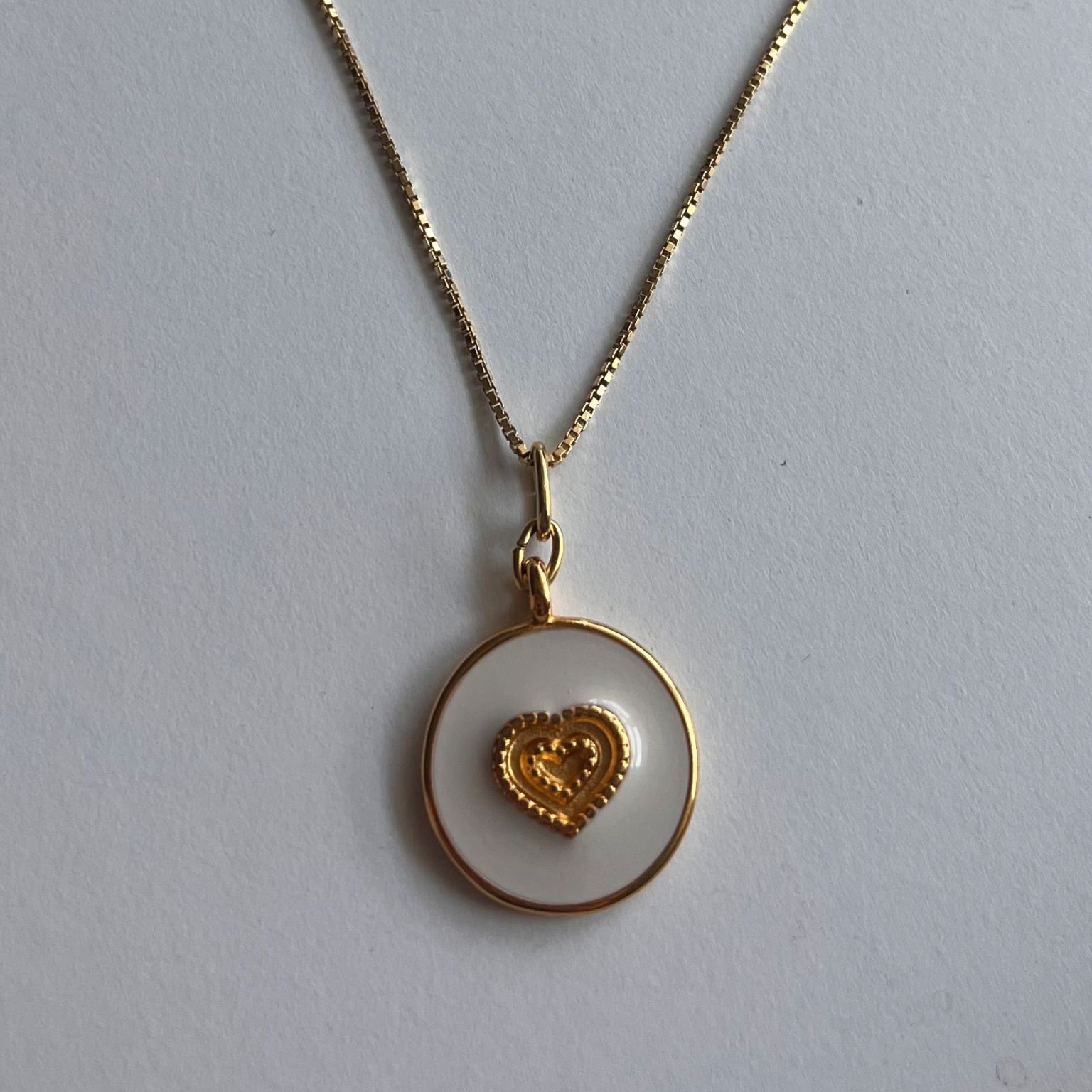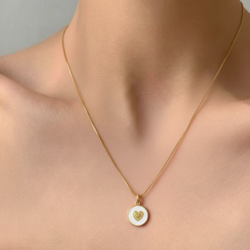 Descubre la belleza atemporal de nuestro colgante "Corazón Puro", una pieza que combina la sofisticación minimalista con un mensaje de amor y pureza. Este delicado colgante presenta una chapa de zamak redonda bañada en oro con un exquisito esmalte blanco que irradia luz y serenidad. En su centro, un corazón dorado en relieve, finamente detallado, se convierte en el alma de la joya.